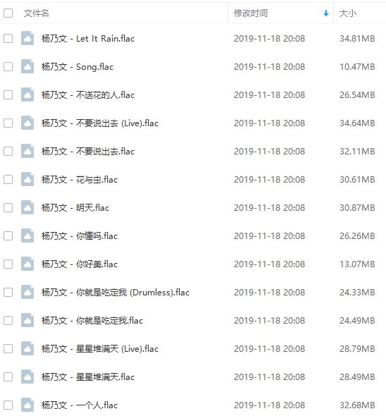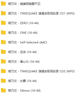 本资源为杨乃文专辑歌曲合集-8张专辑(1997-2019)无损音乐打包合集[FLAC/MP3/2.70GB]百度云网盘下载,包含杨乃文8张专辑+2CD歌曲,歌曲格式为FLAC+MP3,按专辑做压缩包处理,为避免资源丢失,请先保存下载解压便可播放试听。