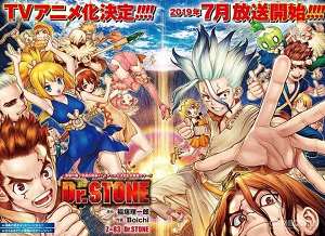 《Dr.STONE》(新石纪)改编自稻垣理一郎原作、Boichi作画的同名漫画,于2018年11月19日宣布了动画化的消息。动画由TMS Entertainment负责制作,第1期于2019年7月5日至12月13日每周五在TOKYO MX首播,全24集。官方在2019年12月13日宣布了第2期制作决定的消息,于2021年1月14日播出。