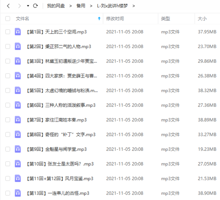 本资源为刘心武版108回《红楼梦》全集126个音频文件[MP3]百度云网盘下载,有声小说格式为MP3,资源做压缩包处理,避免资源丢失,请先保存下载再解压便可播放试听。