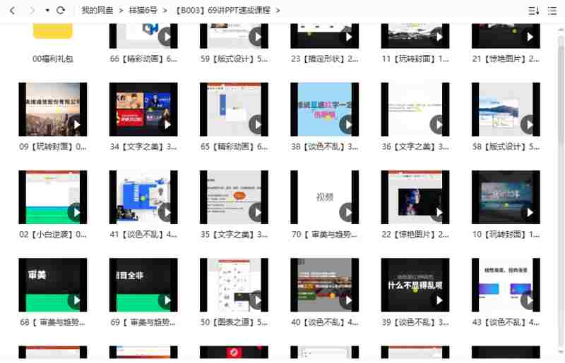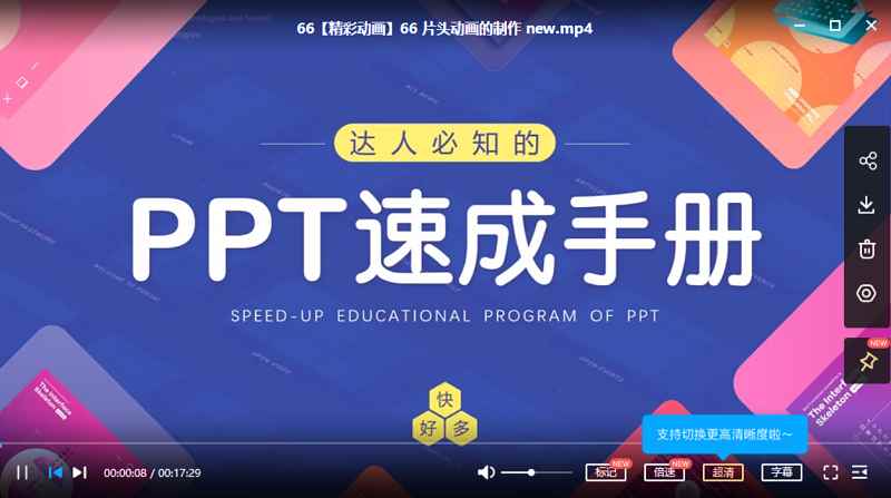 本资源为PPT速成69讲课程视频(包含千余个模版)国语高清合集[MP4]百度云网盘下载,本次资源格式为MP4,做压缩包处理,避免资源丢失,请先保存下载再解压便可播放。