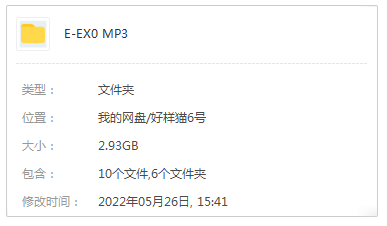 本资源为韩国/EXO组合精选发烧歌曲合集-32张专辑/单曲(2013-2021)高音质音乐打包[MP3/2.56GB]百度云网盘下载,一共包含EXO组合精选发烧歌曲合集-31张专辑,歌曲格式均为MP3,做压缩包处理,按专辑做压缩包处理,为避免资源丢失,不要在线解压,请先保存在下载解压便可播放试听。