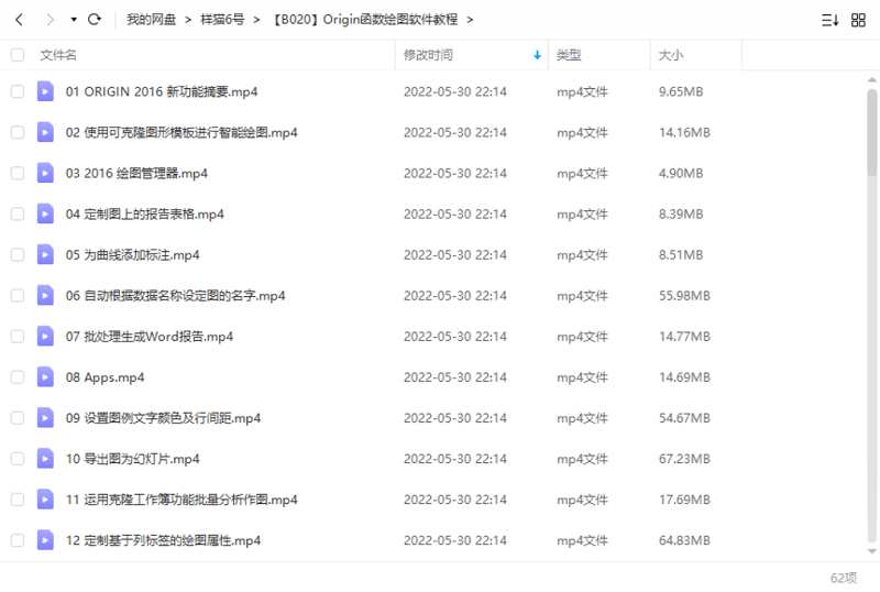 本资源为函数绘图软件Origin共62个课程教学视频高清合集[MP4]百度云网盘下载,本次资源格式为MP4,做压缩包处理,避免资源丢失,请先保存下载再解压便可播放。