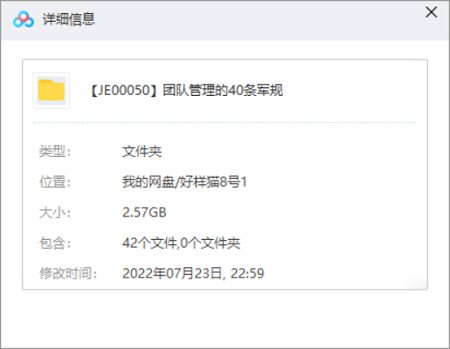 本资源为《团队管理的40条军规》完结版课程视频合集[MP4]百度云网盘下载,本次资源格式为MP4,做压缩包处理,避免资源丢失,请先保存下载再解压便可播放。