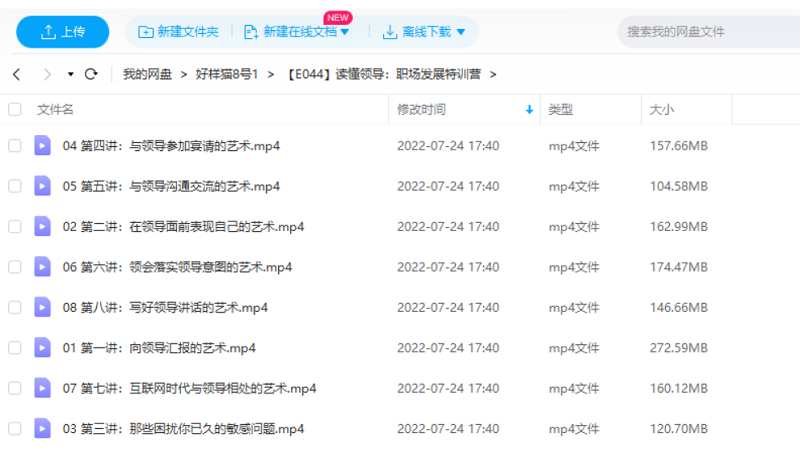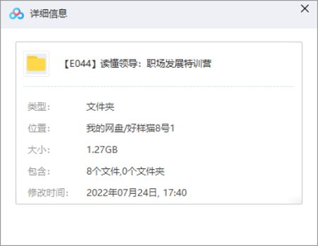 本资源为职场必看-读懂领导:职场发展特训营8部课程视频大合集[MP4]百度云网盘下载,本次资源格式为MP4,做压缩包处理,避免资源丢失,请先保存下载再解压便可播放。(保存到自己网盘后,可在线观看)