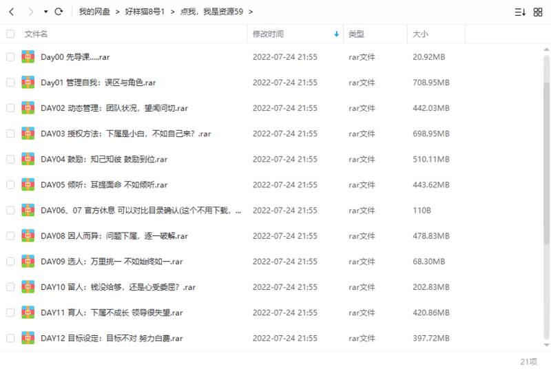 本资源为《21天新任管理者实战训练营》完结版课程视频合集[MP4]百度云网盘下载,本次资源格式为MP4,做压缩包处理,避免资源丢失,请先保存下载再解压便可播放。