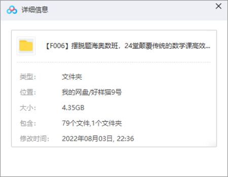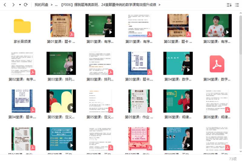 本资源为24堂颠覆传统的数学课高效提升成绩-孩子数学学习视频+课件合集[PDF/MP4]百度云网盘下载,本次资源格式为PDF+MP4,做压缩包处理,避免资源丢失,不要直接在网盘解压,请先保存下载再解压便可播放。