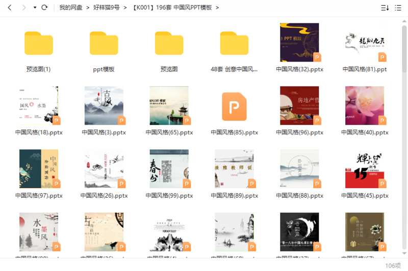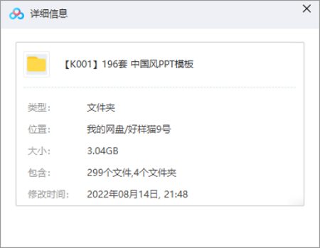 本资源为中国风——PPT模板196套资源大合集[PPT/PPTX]百度云网盘下载,本次资源格式为PPT+PPTX,做压缩包处理,避免资源丢失,不要直接在网盘解压,请先保存下载再解压便可播放。