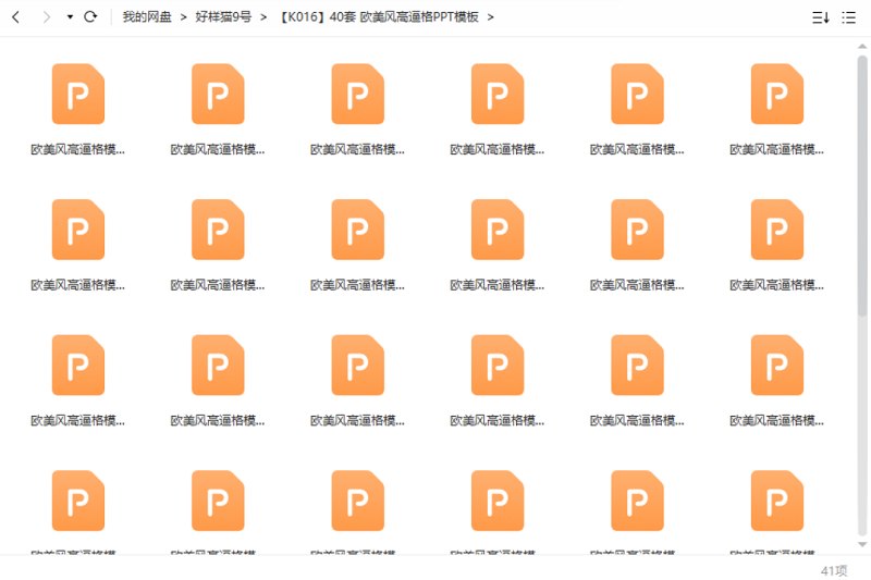 本资源为欧美风高逼格——PPT模板40套资源大合集[PPT/PPTX]百度云网盘下载,本次资源格式为PPT+PPTX,做压缩包处理,避免资源丢失,不要直接在网盘解压,请先保存下载再解压便可播放。