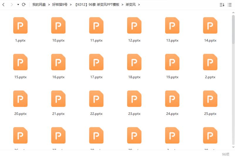 本资源为渐变风——PPT模板96套资源大合集[PPT/PPTX]百度云网盘下载,本次资源格式为PPT+PPTX,做压缩包处理,避免资源丢失,不要直接在网盘解压,请先保存下载再解压便可播放。