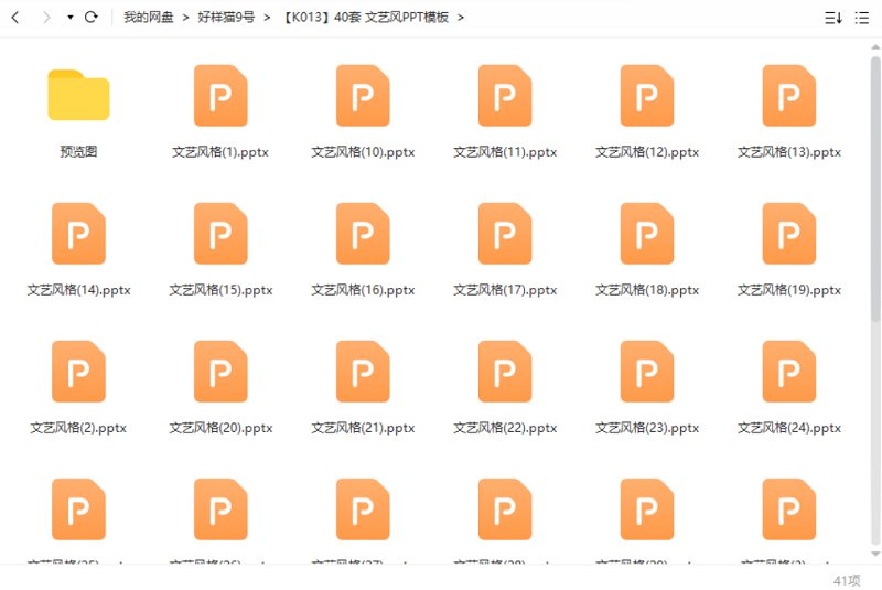 本资源为文艺风——PPT模板40套资源大合集[PPT/PPTX]百度云网盘下载,本次资源格式为PPT+PPTX,做压缩包处理,避免资源丢失,不要直接在网盘解压,请先保存下载再解压便可播放。