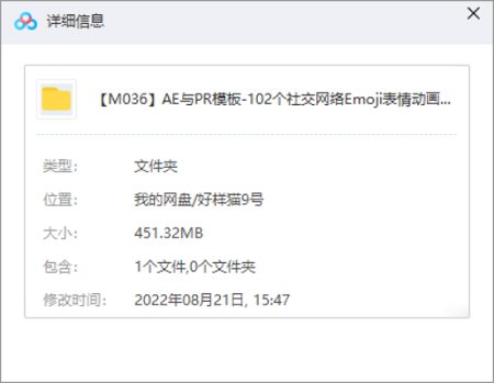 本资源为AE与PR模板-102个社交网络Emoji表情动画+视频素材合集[RAR]百度云网盘下载,本次资源格式为RAR,做压缩包处理,避免资源丢失,不要直接在网盘解压,请先保存下载再解压便可播放。