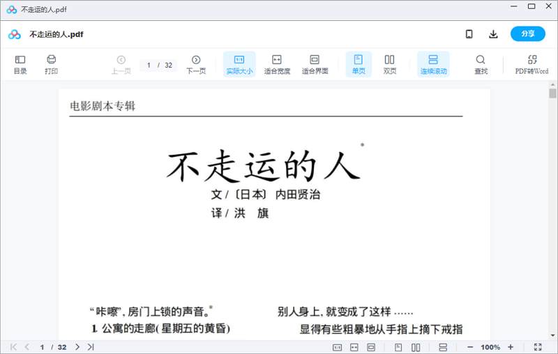 本资源为剧情电影《遇人不熟(不走运的人)》剧本电子文档[PDF]百度云网盘下载,本次资源格式为PDF,做压缩包处理,避免资源丢失,不要直接在网盘解压,请先保存下载再解压便可播放。