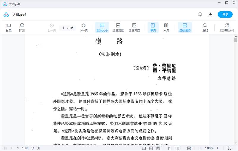 本资源为意大利经典电影《大路》剧本电子文档[PDF]百度云网盘下载,本次资源格式为PDF,做压缩包处理,避免资源丢失,不要直接在网盘解压,请先保存下载再解压便可播放。