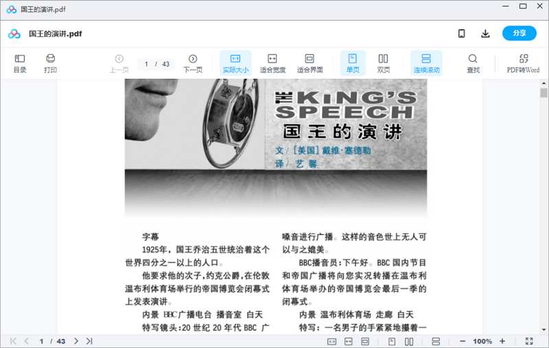 本资源为精选电影剧本-《国王的演讲》电影剧本电子文档[PDF]百度云网盘下载,本次资源格式为PDF,做压缩包处理,避免资源丢失,不要直接在网盘解压,请先保存下载再解压便可播放。