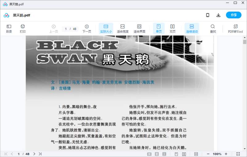本资源为精选电影剧本-《黑天鹅》电影剧本电子文档[PDF]百度云网盘下载,本次资源格式为PDF,做压缩包处理,避免资源丢失,不要直接在网盘解压,请先保存下载再解压便可播放。