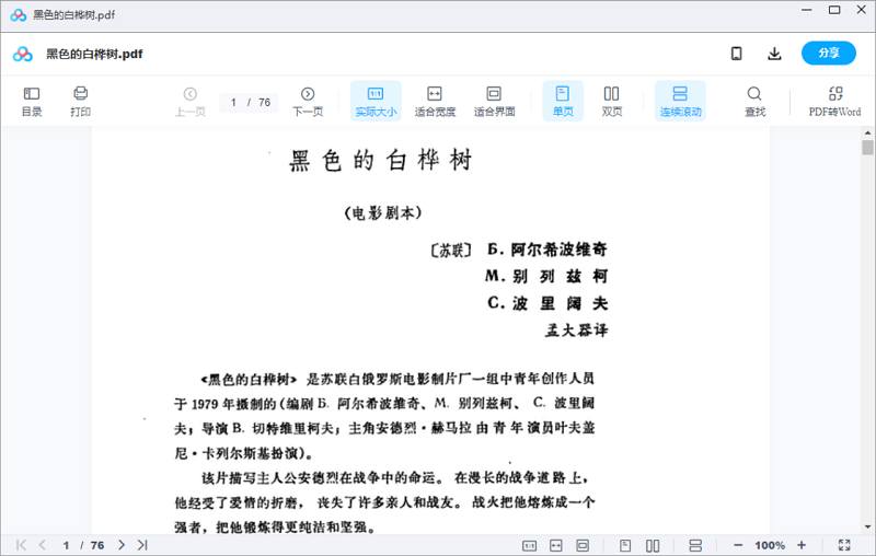 本资源为精选电影剧本-《黑色的白桦树》电影剧本电子文档[PDF]百度云网盘下载,本次资源格式为PDF,做压缩包处理,避免资源丢失,不要直接在网盘解压,请先保存下载再解压便可播放。