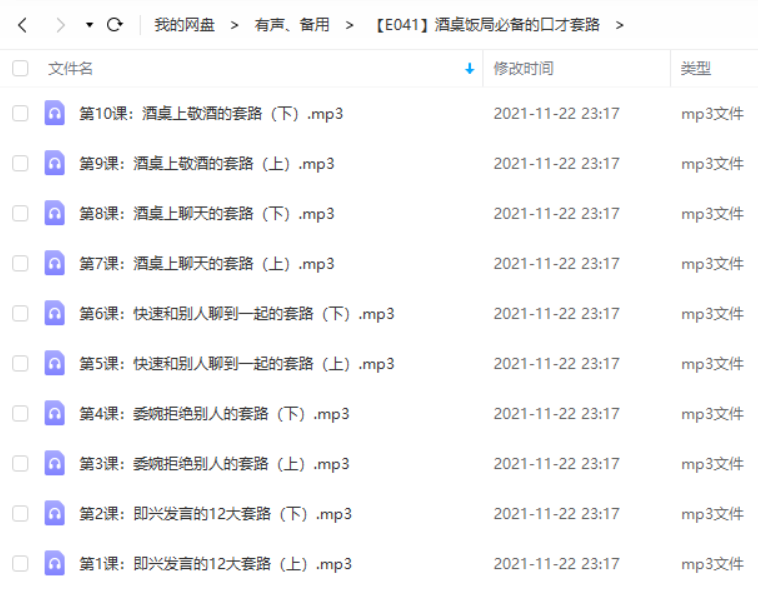 本资源为《酒桌饭局必备》-让你谈笑风生的口才锻炼课程音频合集[MP3]百度云网盘下载,本次资源格式为MP3,资源做压缩包处理,为避免资源丢失,不要在线解压,请先保存在下载解压便可播放试听。