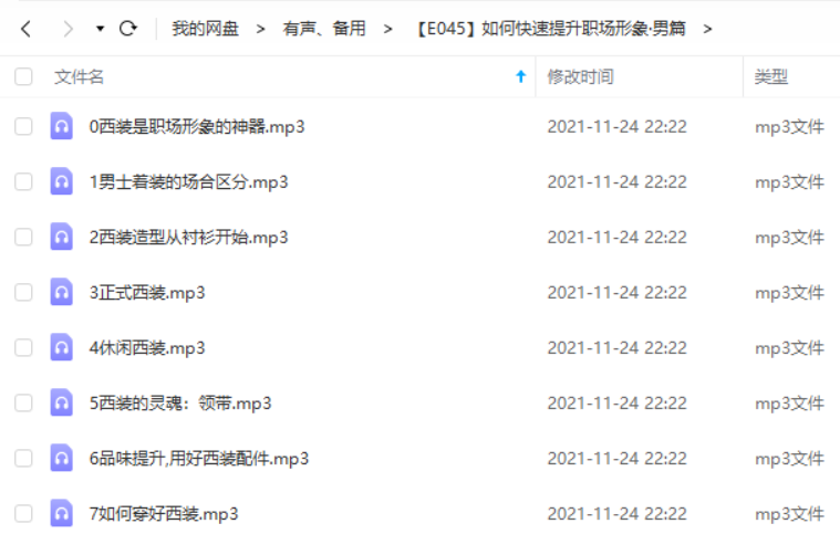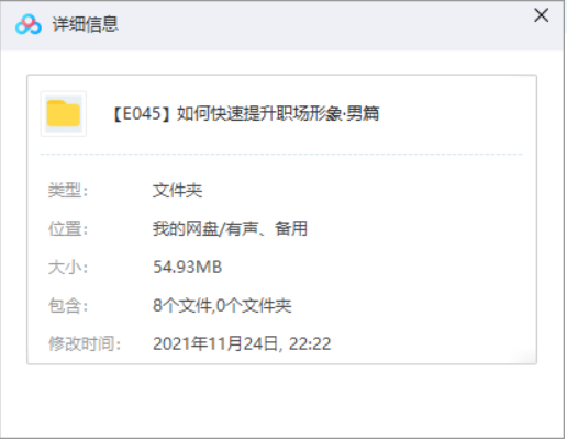 本资源为《如何快速提升职场形象》男篇8部有声音频高清合集[MP3]百度云网盘下载,本次资源格式为MP3,资源做压缩包处理,为避免资源丢失,不要在线解压,请先保存在下载解压便可播放试听。