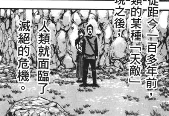 该漫画107年前(743年),世界上突然出现了人类的天敌“巨人”。面临着生存危机而残存下来的人类逃到了一个地方,盖起了三重巨大的城墙。人们在这隔绝的环境里享受了一百多年的和平,直到艾伦·耶格尔十岁那年,60米高的“超大型巨人”突然出现,以压倒性的力量破坏城门,其后瞬间消失,凶残的巨人们成群的冲进墙内捕食人类。