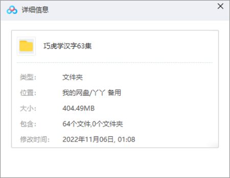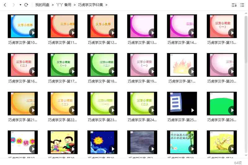 本资源为巧虎系列之《巧虎学汉字》全63集视频打包[RMVB]百度云网盘下载,本次资源格式为RMVB,做压缩包处理,避免资源丢失,不要直接在网盘解压,请先保存下载再解压便可播放。(保存到自己网盘后,支持在线观看)
