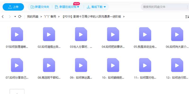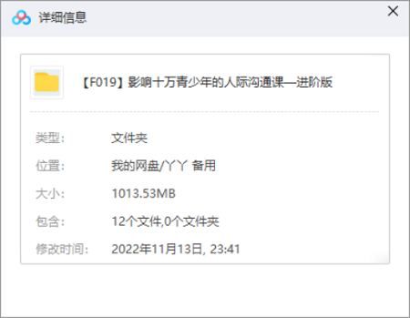本资源为影响十万青少年的人际沟通课——进阶版12集视频打包[MP4]百度云网盘下载,本次资源格式为MP4,做压缩包处理,避免资源丢失,不要直接在网盘解压,请先保存下载再解压便可播放。(保存到自己网盘后,支持在线观看)