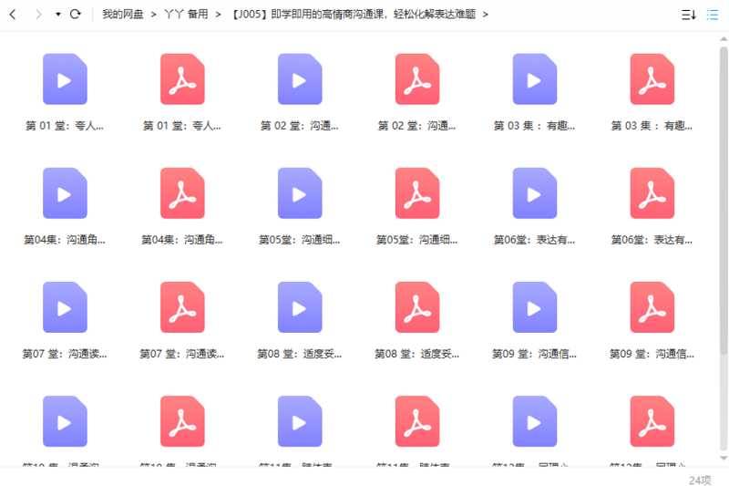 本资源为即学即用的高情商沟通课,轻松化解表达难题完结版视频+文档合集[PDF/MP4]百度云网盘下载,本次资源格式为PDF+MP4,做压缩包处理,避免资源丢失,不要直接在网盘解压,请先保存下载再解压便可播放。(保存到自己网盘后,支持在线观看)