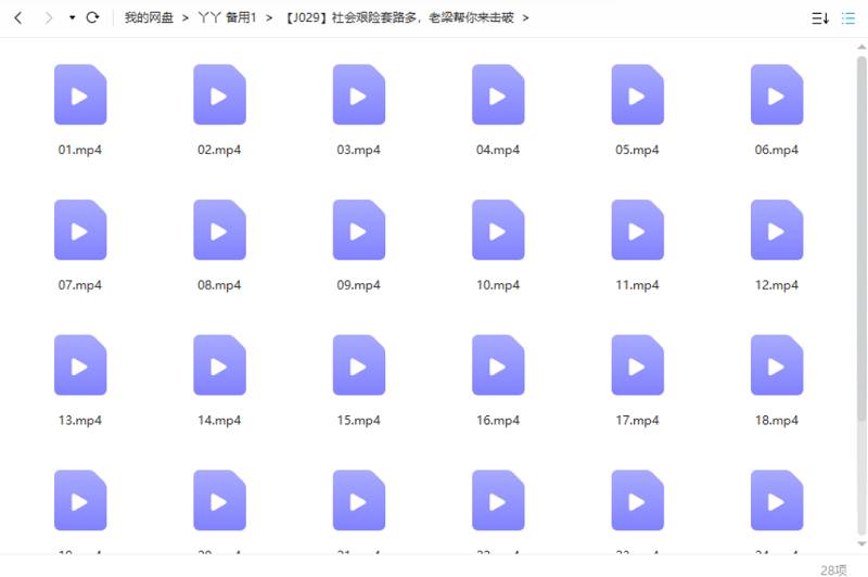 本资源为社会艰险套路多,老梁帮你来击破28个视频合集[MP4]百度云网盘下载,本次资源格式为MP4,做压缩包处理,避免资源丢失,不要直接在网盘解压,请先保存下载再解压便可播放。(保存到自己网盘后,支持在线观看)