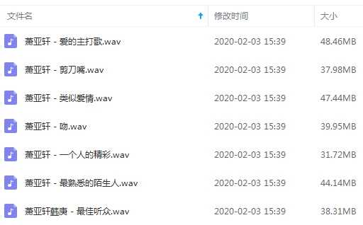 本资源为萧亚轩7首经典流行发烧歌曲合集打包[WAV/288.01MB]百度云网盘下载 ,包含萧亚轩7首经典流行发烧歌曲合集,歌曲格式为WAV,按专辑做压缩包处理,为避免资源丢失,不要在线解压,请先保存在下载解压便可播放试听。