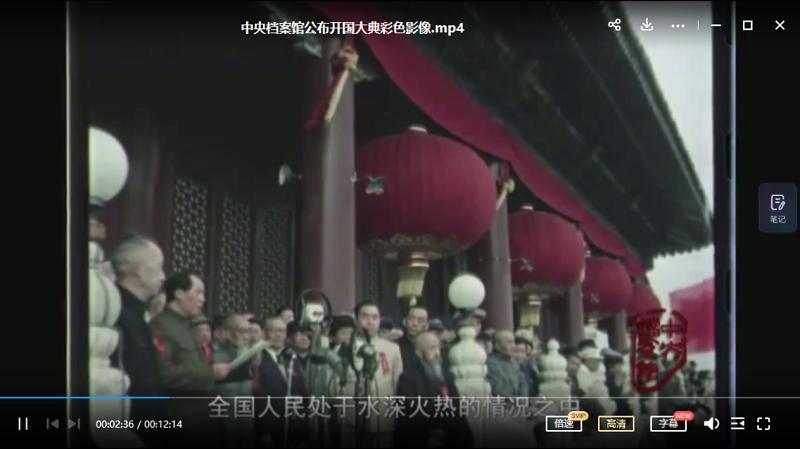 本资源为中央档案馆公布《开国大典彩色影像》540P画质12分钟14秒完整版视频国语中字[MP4]百度云网盘下载,本次资源格式为MP4,做压缩包处理,避免资源丢失,不要直接在网盘解压,请先保存下载再解压便可播放。
