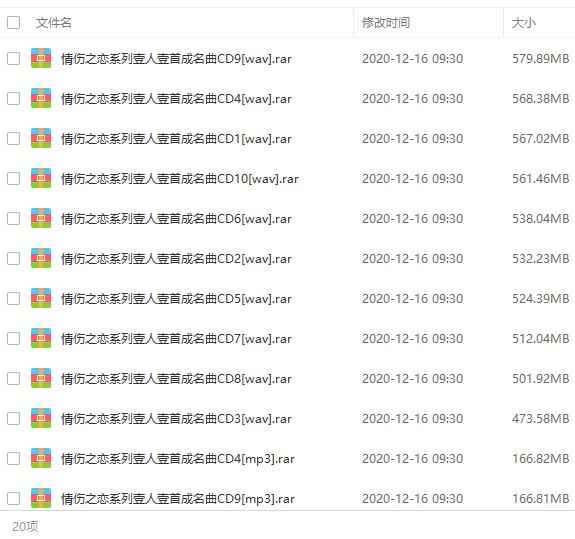 本资源为老歌怀旧《情伤之恋系列之一人一首成名曲》10CD精品歌曲合集打包[WAV/MP3/6.76GB]百度云网盘下载 ,包含《情伤之恋系列之一人一首成名曲》10CD合集,歌曲格式为WAV,按专辑做压缩包处理,为避免资源丢失,不要在线解压,请先保存在下载解压便可播放试听。