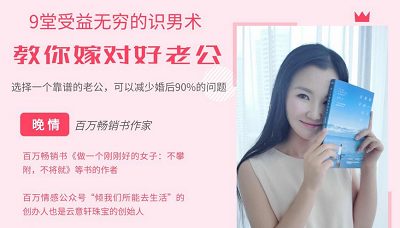 女性应该有自己的想法、知识和智慧。这些东西不仅是你独特的魅力,也是你活的真正支持。9堂受益无穷的识男术,教你嫁对好老公,选择一个靠谱的老公,可以减少婚后90%的问题。