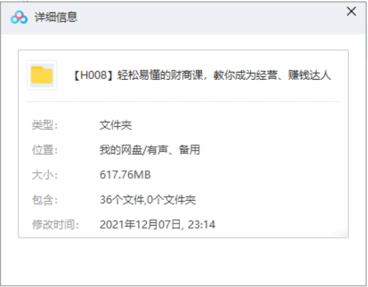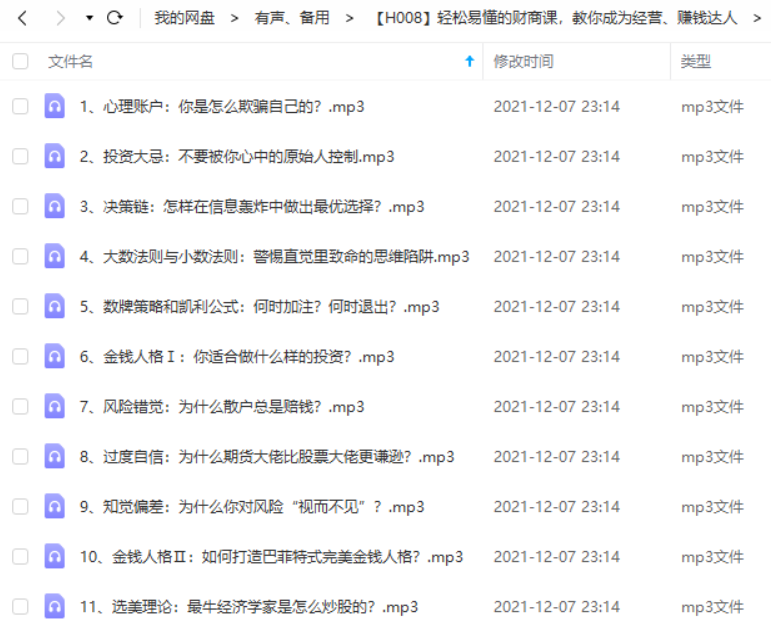 本资源为财商课,教你如何成为经营、赚钱达人有声读物音频合集[MP3]百度云网盘下载,本次资源格式为MP3,资源做压缩包处理,为避免资源丢失,不要在线解压,请先保存在下载解压便可播放试听。