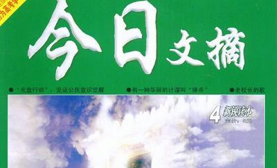 《今 日文摘》是特别为中青年读者群打造全新概念的大型综合性文摘半月刊,内容涵盖社会的、人生的、心灵的关怀,深挖“今 日”内涵并充分体现南方特色,令人开阔眼界、增长见识、领略文采、享受精华,启迪人生的美文,催人泪下的情感,风趣诙谐的幽默,使读者受益匪浅。