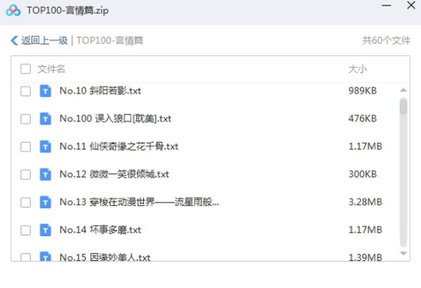 本资源为言情小说合集-100篇言情小说作品电子书合集[TXT]迅雷云网盘下载,本次资源格式为TXT,做压缩包处理,避免资源丢失,不要直接在网盘解压,请先保存下载再解压便可观看。