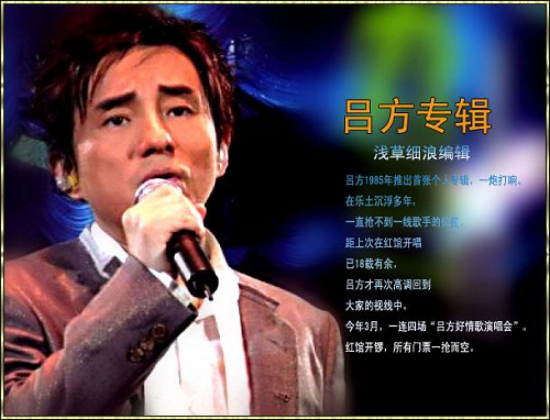 现在,听着吕 方的唱片,歌唱技巧还是不比张学友逊色,但红极- -时的歌曲并不多。所以,他时运不济,-直在二线上沉浮。这样的结果不只是命运,也不是吕方缺乏观众缘, 而是他缺少强烈的个人风格,不管歌声多么出色,平凡的相貌加上面目模糊的唱腔,没有理由要求人们牢牢记住。想在风起云涌的歌坛出人头地,需要的不仅仅是 唱功–吕方就是最好的例子。