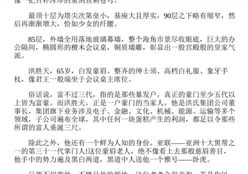开头就很精彩,宛如枪战电影中最箭弩拔张的场面。号称亚洲十大黑帮之一的掌门接到了猎杀名单,就在他精心布置打算应对之时,他的生命戛然而止。开篇的枪林弹雨设置了一个迷局,铺垫出一个“大”的背景,吸引着读者往下看。