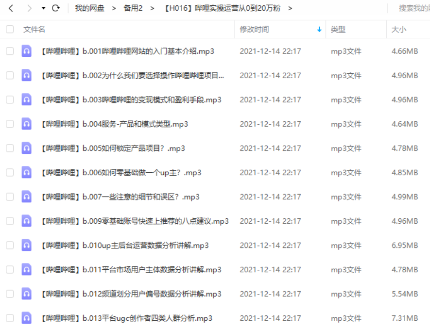 本资源为B站哔哩哔哩涨粉运营策略,从0到20万粉教程有声合集[MP3]百度云网盘下载,本次资源格式为MP3,资源做压缩包处理,为避免资源丢失,不要在线解压,请先保存在下载解压便可播放试听。