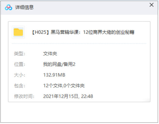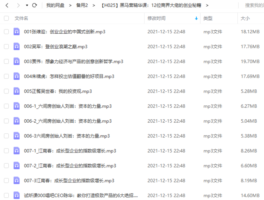本资源为黑马营《12位商界大佬的创业秘籍》精华课有声合集[MP3]百度云网盘下载,本次资源格式为MP3,资源做压缩包处理,为避免资源丢失,不要在线解压,请先保存在下载解压便可播放试听。