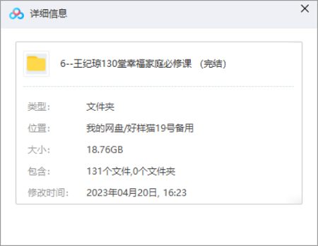 本资源为王纪琼《130堂幸福家庭必修课》完结版课程视频合集[MP4]百度云网盘下载,本次资源格式为MP4,做压缩包处理,避免资源丢失,不要直接在网盘解压,请先保存下载再解压便可播放。
