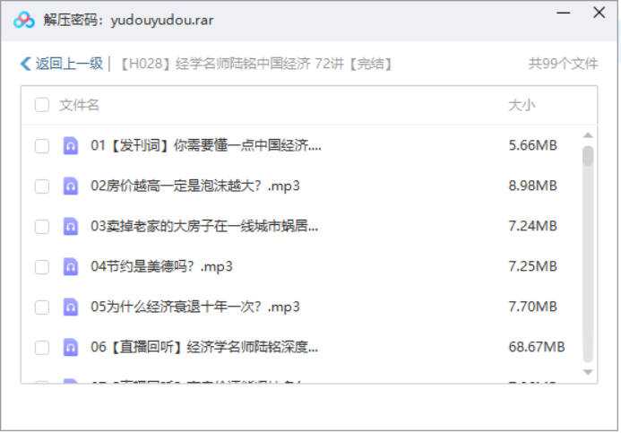 本资源为经学名师陆铭:中国经济72讲有声读物和课件打包合集[PDF/MP3]百度云网盘下载,本次资源格式为PDF+MP3,资源做压缩包处理,为避免资源丢失,不要在线解压,请先保存在下载解压便可播放试听。