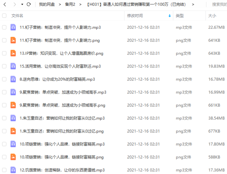 本资源为朱玉童《普通人如何通过营销赚取第一个100万》有声+课件打包合集[PNG/MP3]百度云网盘下载,本次资源格式为PNG+MP3,资源做压缩包处理,为避免资源丢失,不要在线解压,请先保存在下载解压便可播放试听。