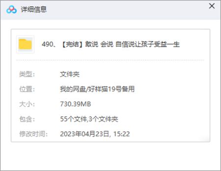 本资源为焦焦老师口才表达课-《敢说会说自信说》孩子+家长+练习三门课程[MP4]百度云网盘下载,本次资源格式为MP4,做压缩包处理,避免资源丢失,不要直接在网盘解压,请先保存下载再解压便可播放。