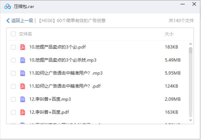 本资源为《60个简单有效的广告创意》课程有声读物和课件高清合集[PDF/MP3]百度云网盘下载,本次资源格式为MP3+PDF,资源做压缩包处理,为避免资源丢失,不要在线解压,请先保存在下载解压便可播放试听。