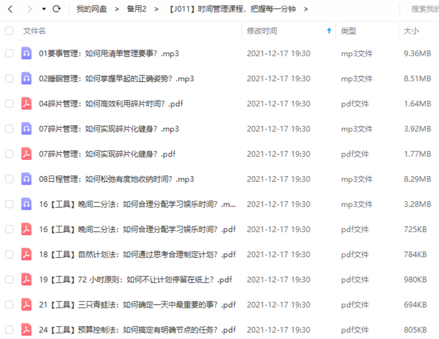本资源为把握每一分钟-《时间管理课程》有声音频+课件合集[PDF/MP3]百度云网盘下载,本次资源格式为MP3,资源做压缩包处理,为避免资源丢失,不要在线解压,请先保存在下载解压便可播放试听。