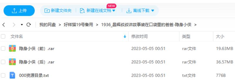 本资源为昌辉叔叔讲故事-装在口袋里的爸爸:隐身小侠全14讲音频[M4A]百度云网盘下载,本次资源格式为M4A,做压缩包处理,避免资源丢失,不要直接在网盘解压,请先保存下载再解压便可播放。
