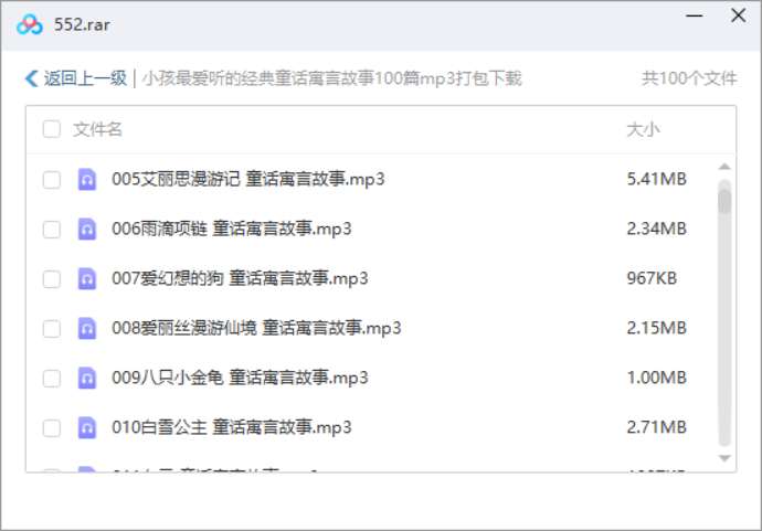 本资源为故事童话-《小孩喜欢的童话寓言故事》全100讲合集[MP3]百度云网盘下载,本次资源格式为MP3,做压缩包处理,避免资源丢失,不要直接在网盘解压,请先保存下载再解压便可播放。