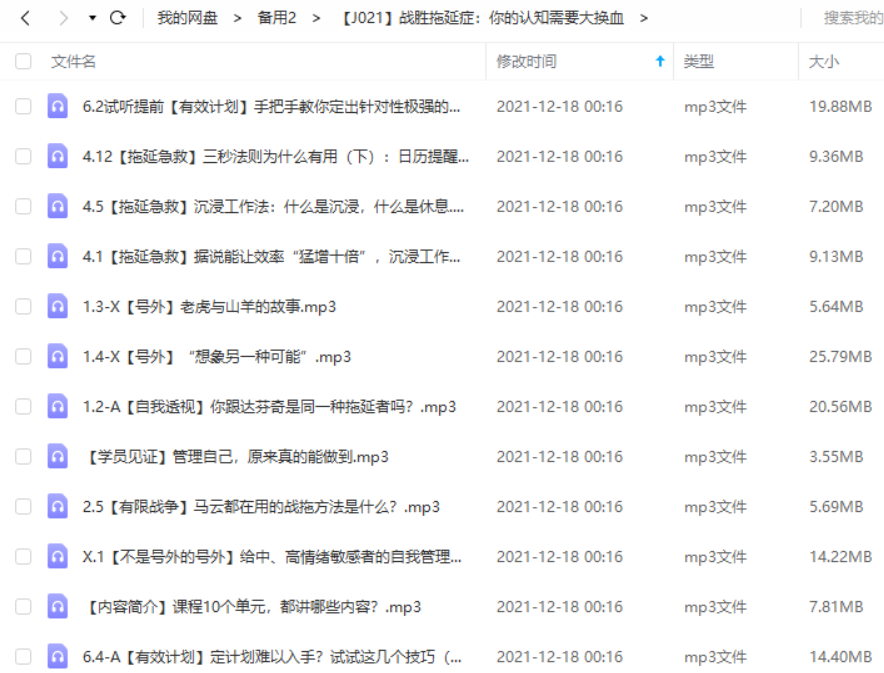 本资源为《战胜拖延症:你的认知需要大换血》课程有声音频合集[MP3]百度云网盘下载,本次资源格式为MP3,资源做压缩包处理,为避免资源丢失,不要在线解压,请先保存在下载解压便可播放试听。