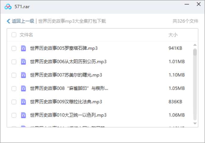 本资源为故事童话-《世界历史故事》全327讲音频合集[MP3]百度云网盘下载,本次资源格式为MP3,做压缩包处理,避免资源丢失,不要直接在网盘解压,请先保存下载再解压便可播放。