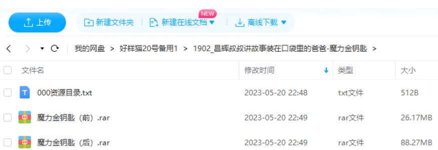 本资源为昌辉叔叔讲故事-《装在口袋里的爸爸:魔力金钥匙》全22讲音频[MP3]百度云网盘下载,本次资源格式为MP3,做压缩包处理,避免资源丢失,不要直接在网盘解压,请先保存下载再解压便可播放。
