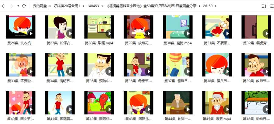 本资源为教育类动画-《福锅囍眉科普小园地》全50集视频[MP4]百度云网盘下载,本次资源格式为MP4,做压缩包处理,避免资源丢失,不要直接在网盘解压,请先保存下载再解压便可播放。